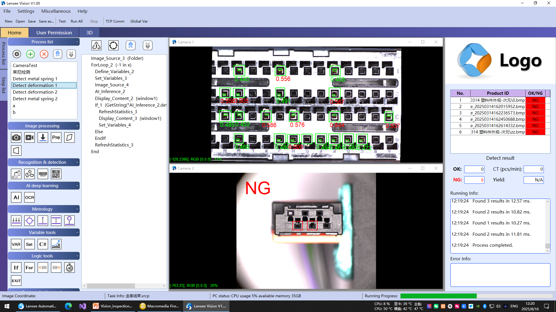 2. Our vision app: For many vision-related projects, rewriting or modifying code at the base level—using languages like C++ or C#—can be time-consuming and costly, requiring extensive programming expertise and increasing both project timelines and labor costs. To address this, we have developed a zero-code/low-code vision platform that is intuitive, easy to learn, and quick to deploy. With our app, there is little need to put highly specialized programmers to automated vision inspection projects; anyone with basic programming knowledge—or even a motivated beginner—can rapidly implement vision solutions. The platform currently offers a comprehensive suite of tools, including image acquisition, image preprocessing, AI-based prediction, OCR, template matching, and calibration. Support for simple axis motion and IO control will be available soon.